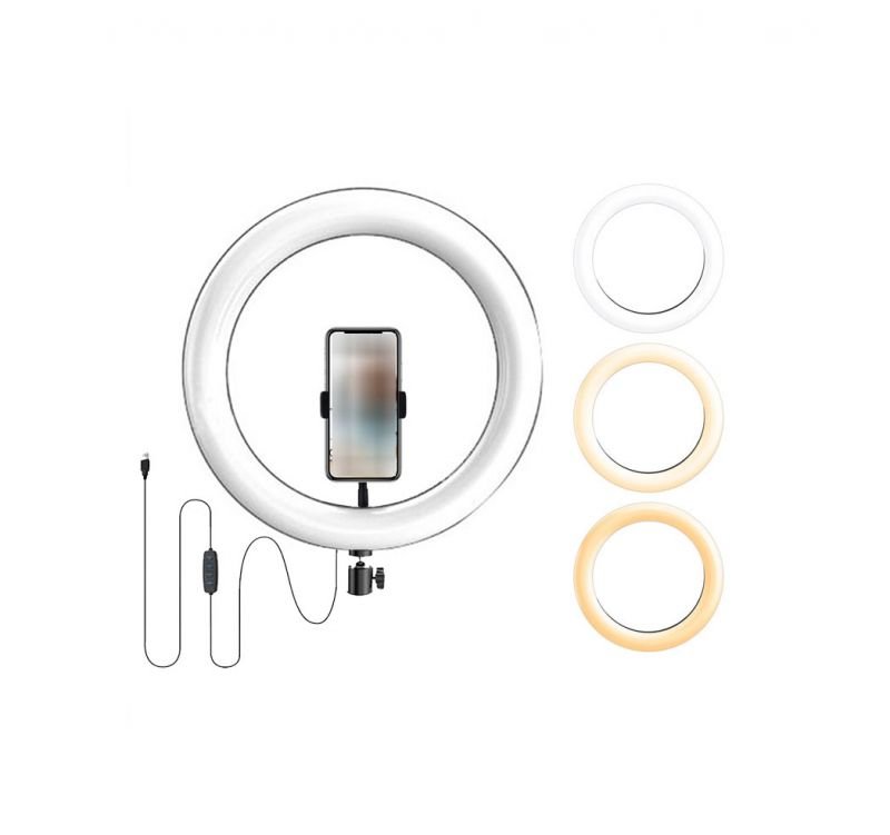 تصدر حلقة الإضاءة الليد ثلاثة ألوان : الضوء الدافئ / الضوء الأبيض / الضوء البارد ، السطوع قابل للتعديل ، ناعم ومريح للعين مناسب للتصوير في اي مكان واي اضاءة في المكان