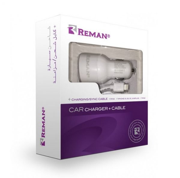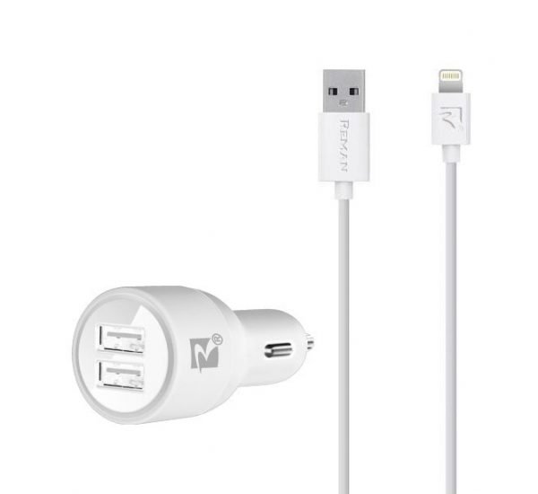 ريمان شاحن سيارة بمخرجين USB مع كابل للايفون لون أبيض