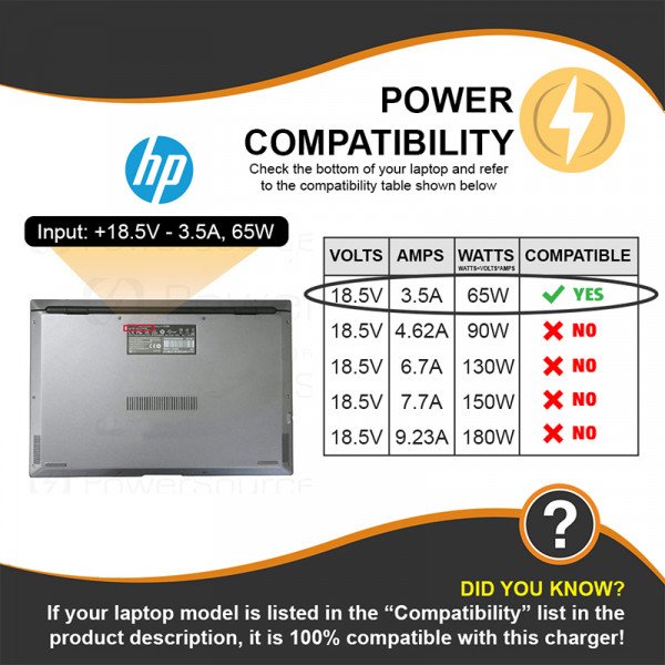 شاحن لاب توب اتش بي عالي الجودة 18.5 فولت 3.5 امبير 65 وات – مقاس السوكت 4.8 * 1.7 مم