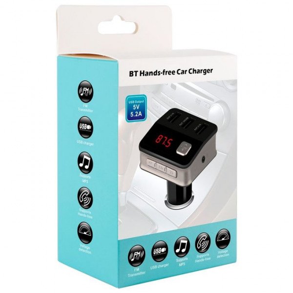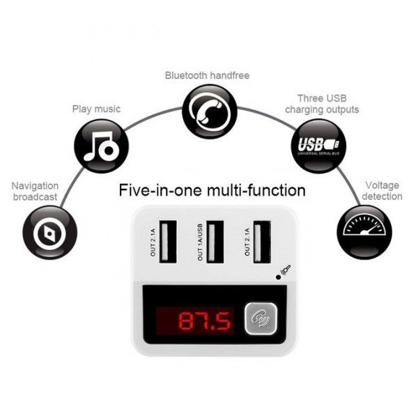 شاحن وجهاز ارسال موجات اف ام ومشغل ام بي 3 للسيارات مع 2 منفذ يو اس بي بتقنية كوالكوم للشحن السريع ومدخل صوت AUX وتشغيل الصوتيات عن طريق USB والرد علي المكالمات لون أبيض