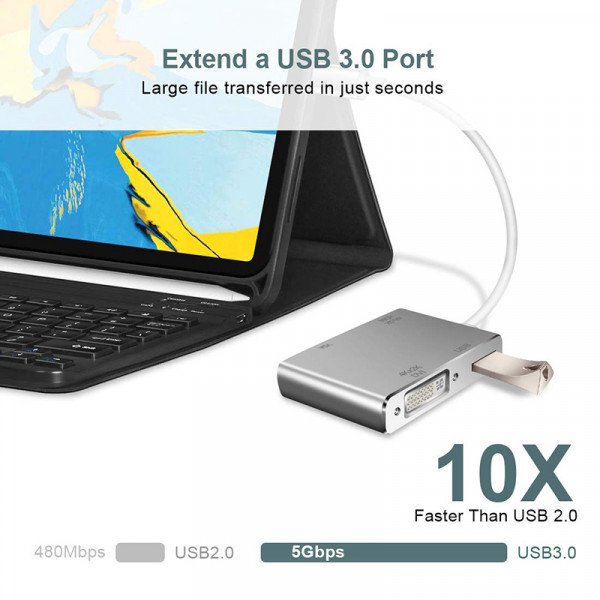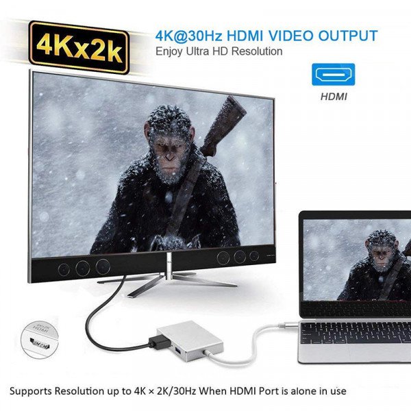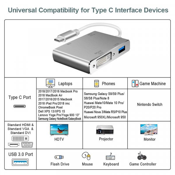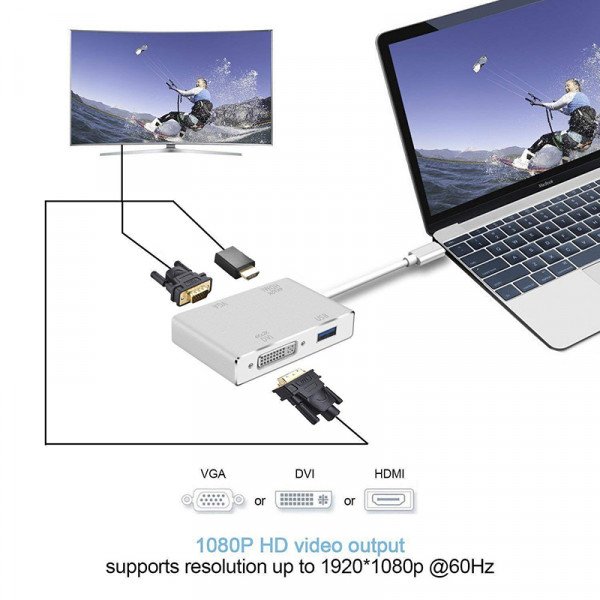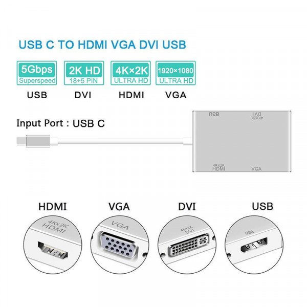 4 في 1 (النوع- C) إلى HDMI VGA DVI Multiport Adapter مع USB2.0 Hub لتوصيل الكمبيوتر / الكمبيوتر المحمول بشاشات HDMI / VGA / DVI المجهزة والشاشات.