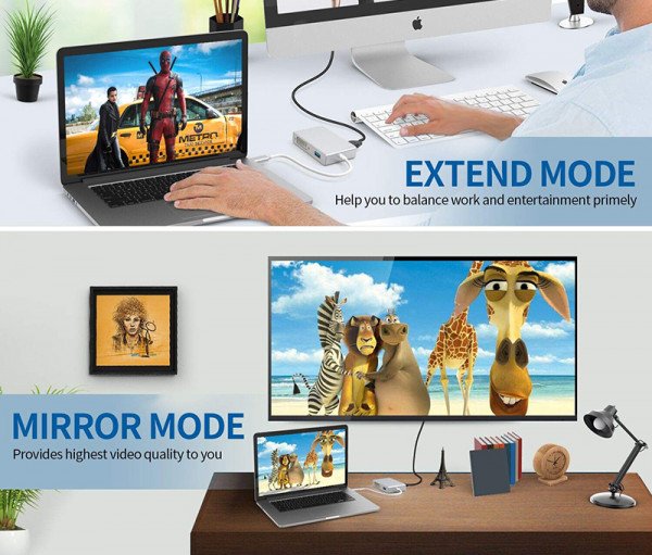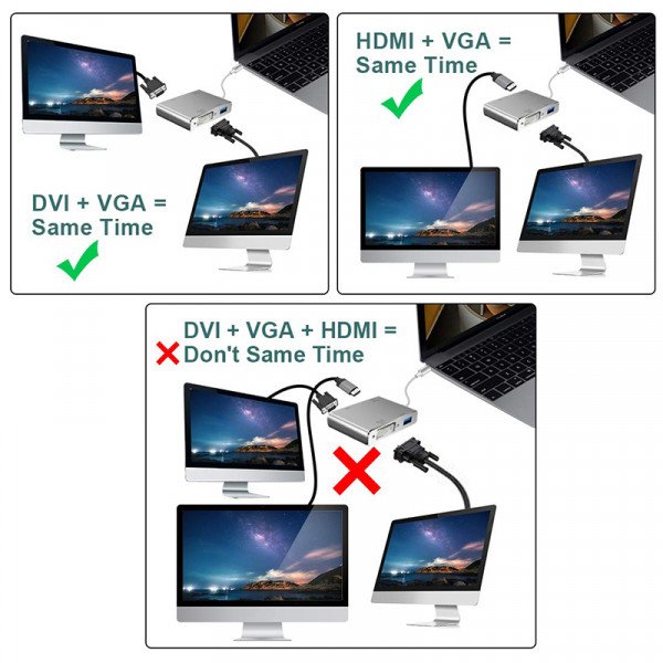 يمكن أن تعمل منافذ HDMI و VGA و DVI و VGA في نفس الوقت ، لكن الدقة القصوى هي 1080 بكسل بينما تعمل في نفس الوقت ، لكن الشاشتان الخارجيتان ستظهران نفس الصورة. (ملاحظة: لا يمكن لمنافذ HDMI و DVI العمل في نفس الوقت)