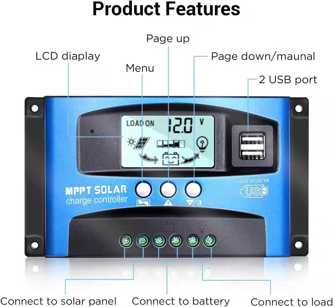 وحدة تحكم شحن الطاقة الشمسية 30 أمبير 12 فولت/24 فولت، منظم بطارية PWM، شاشة LCD قابلة للتعديل مع منفذ USB مزدوج