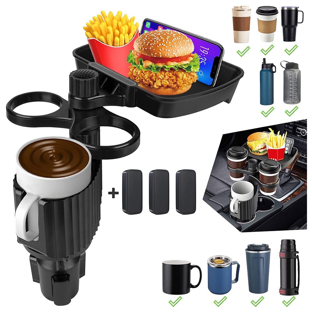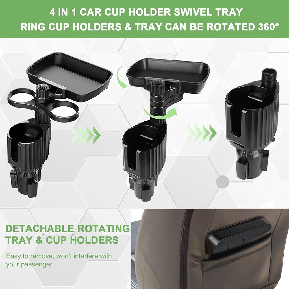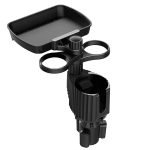 Car cup holder with a detachable rotating food tray in addition to 2 small cup slots and a large cup slot / Model CUP-A05