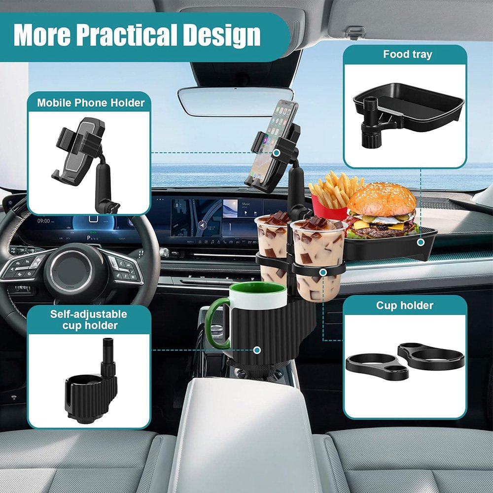 Car cup holder with a detachable rotating food tray in addition to 2 small cup slots and a large cup slot With Mobile holder / Model CUP-A04