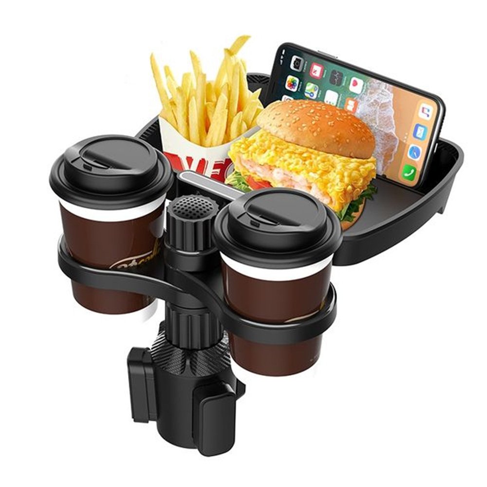 Car cup holder with holder Mobile & a detachable rotating food tray in addition to 2 small cup slots and a large cup slot / Model CUP-B06