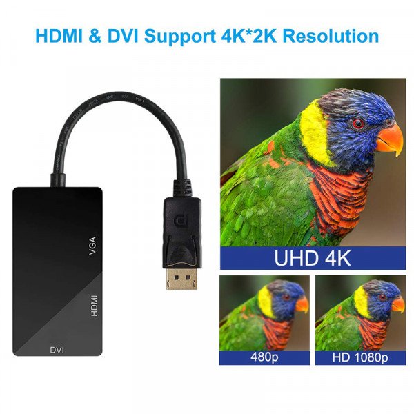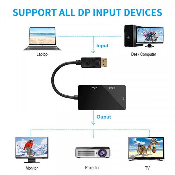 - Portable adapter connects a DisplayPort DP equipped laptop or desktop to an HDTV, monitor, or projector with HDMI/DVI/VGA; Note: Only supports 1 display output at a time,A separate HDMI/DVI/VGA cable is required, not included,Not compatible with USB ports