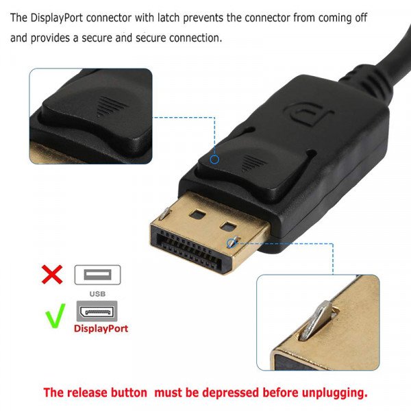 - DisplayPort connector with latches provides a secure connection with a release button that must be depressed before unplugging