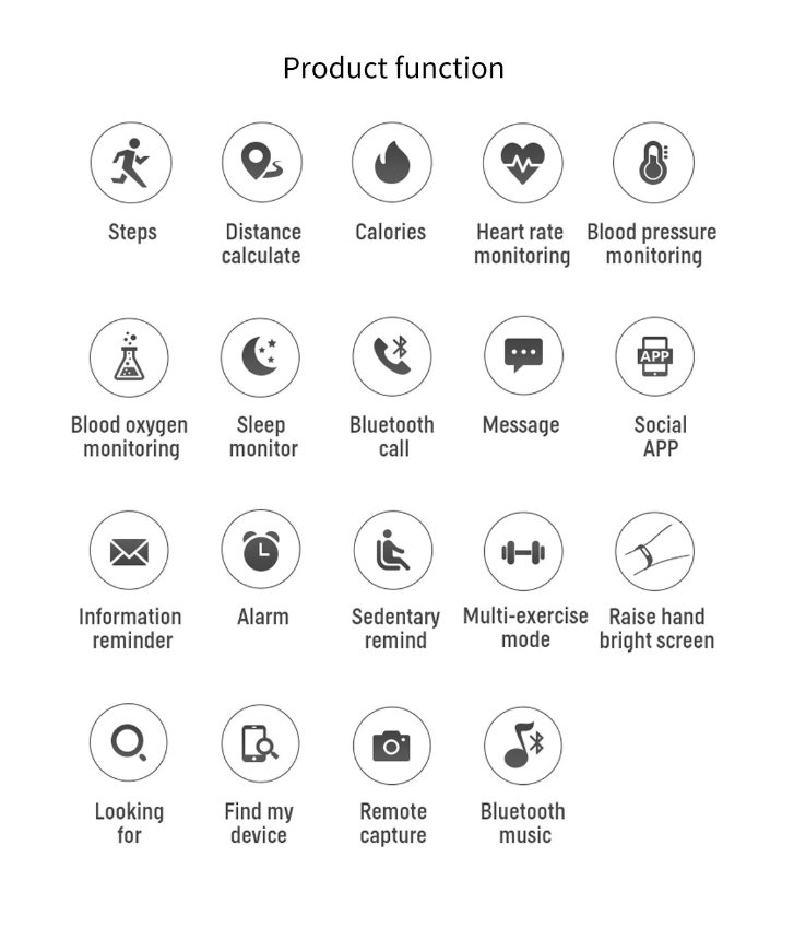 Standard sports functions (steps, distance, calories) Multiple sports mode: climbing, walking, basketball, jogging, table tennis, cycling, swimming, badminton, soccer
