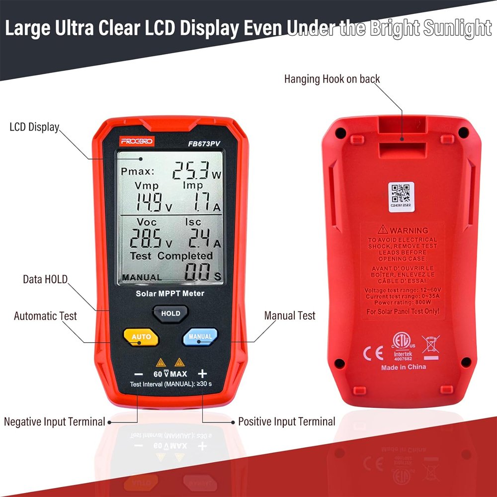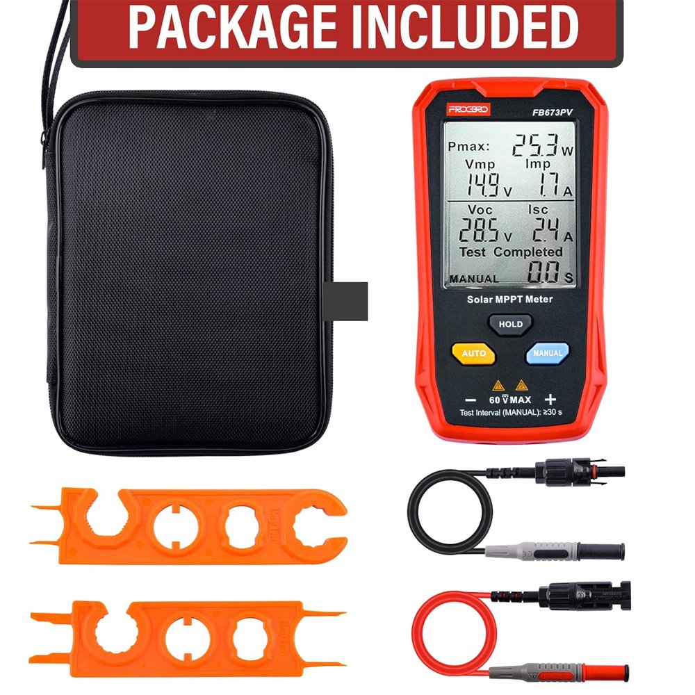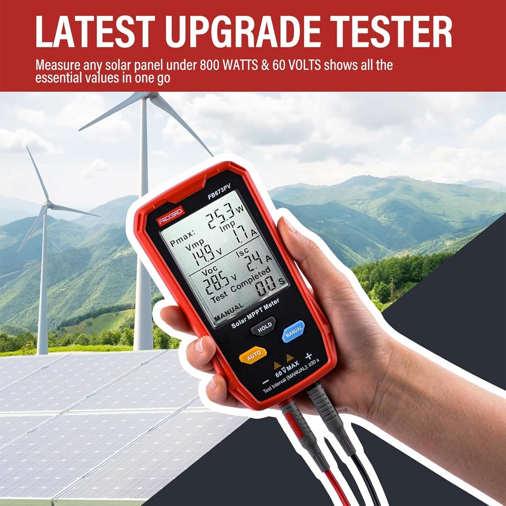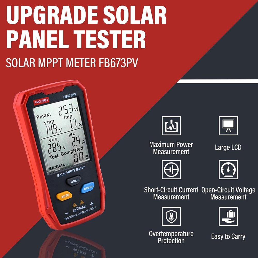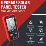 【FB673PV Solar MPPT Meter】With rapid and accurate capabilities, the solar panel tester meter can assess the maximum power output (Pmax), open-circuit voltage (Voc), and short-circuit current (Isc) simultaneously, presenting all relevant data on its clear display. This versatile device is widely employed in the assessment of solar panels and troubleshooting faulty modules. This solar panel tester also distinguishes quality among solar panel brands and aids in finding optimal placement angles.