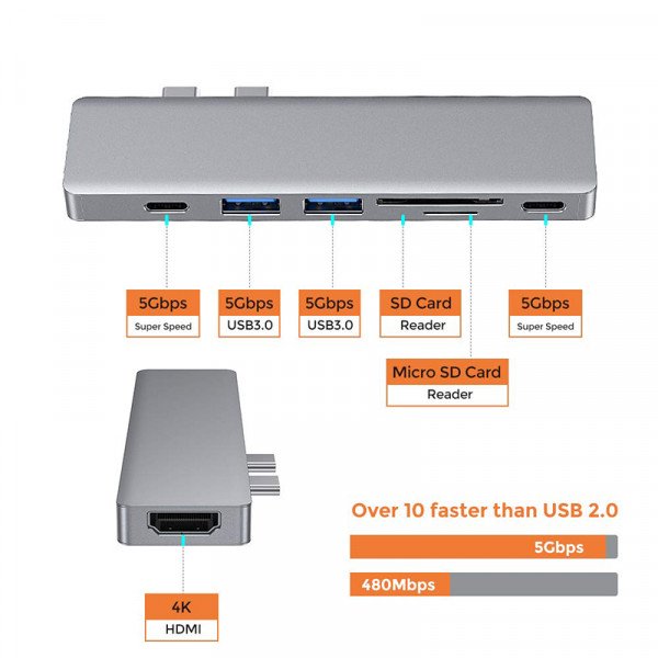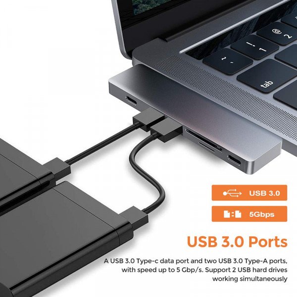 7 IN 1 COMBINATION HUB – 2 USB 3.0 ports, 2 USB-C Charging port,1X HDMI 4K Port, 1 SD Card Reader slot and 1 Micro SD Card Reader slot.